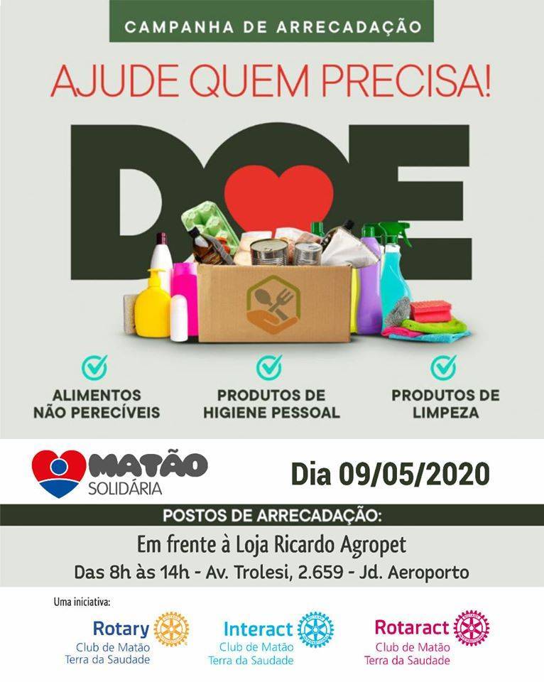 O Rotary Club junto com o Rotaract Club e o Interact Club de Matão-Terra da Saudade, em parceria com o movimento Matão Solidária, lançam a campanha de arrecadação de alimentos não perecíveis, produtos de higiene pessoal e produtos de limpeza.